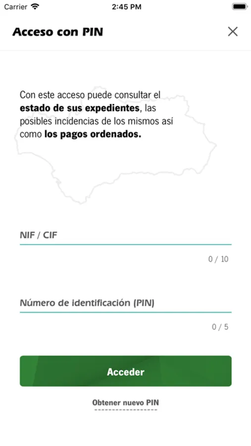 El acceso a la zona privada requiere de un código PIN, que podrá obtener desde la propia app, si dispone de los dígitos de la cuenta bancaria incluida en la última Solicitud de Ayudas PAC presentada.