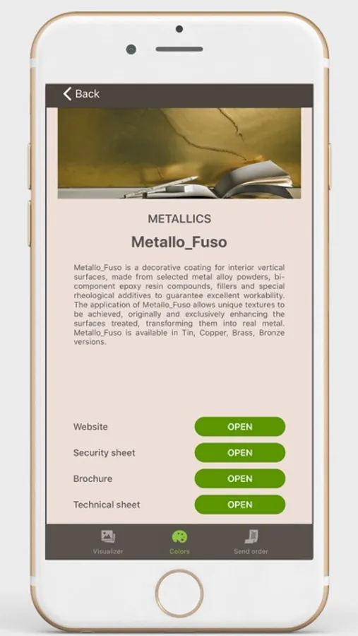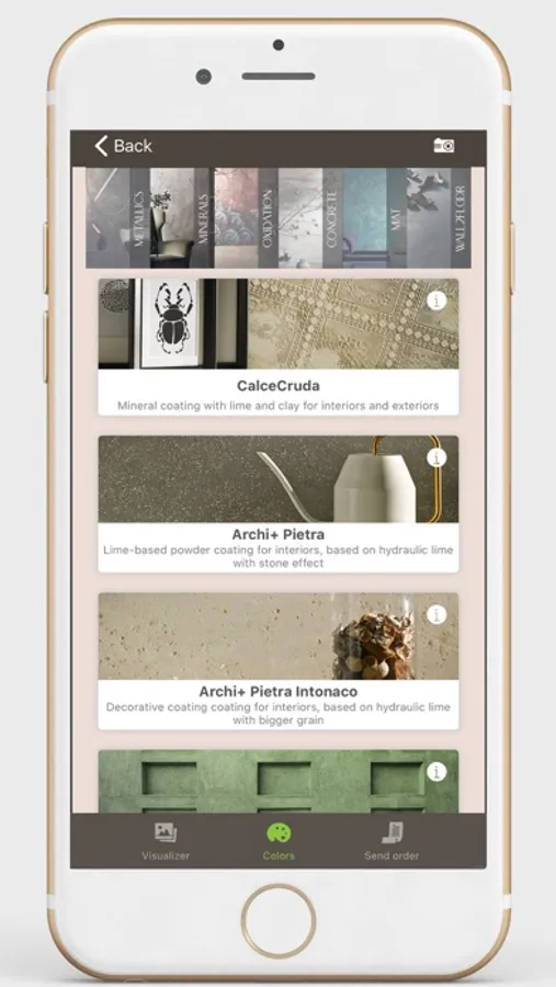 You can choose the finishes from our Decorative textures and/or from our flat paint color swatch for inside or outside use. Select a tint from an image in the Gallery or take a picture with the Camera of your mobile device, using Color-Picker or the NOVACUBE.