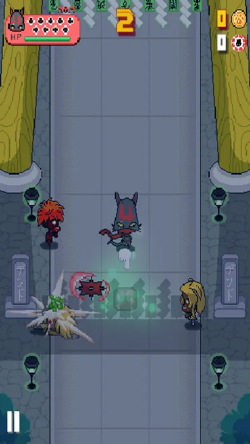 The game offers three playable 9DKP team members with 20 different levels each of increasing challenge. Add up Kats to increase your power, strategize your attacks, and defeat the Cat Demon Babusa's minions. How many points can you earn in this chaotic mess?