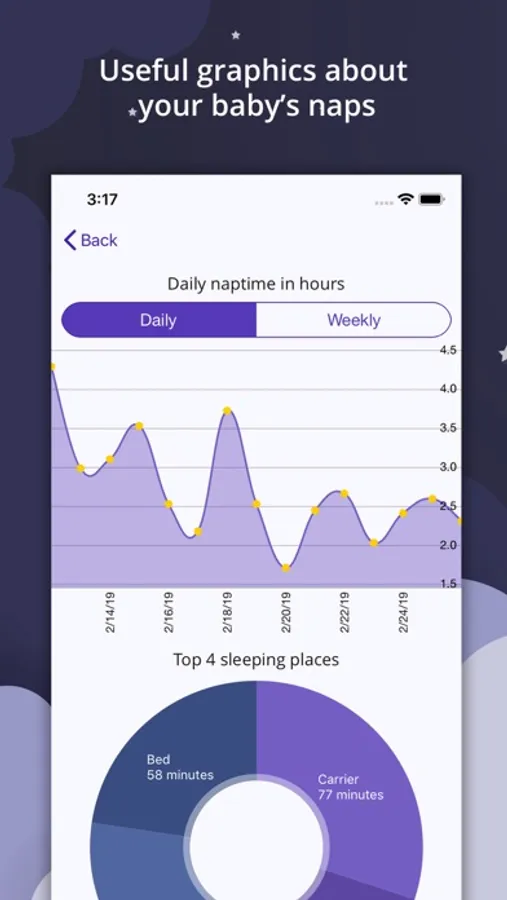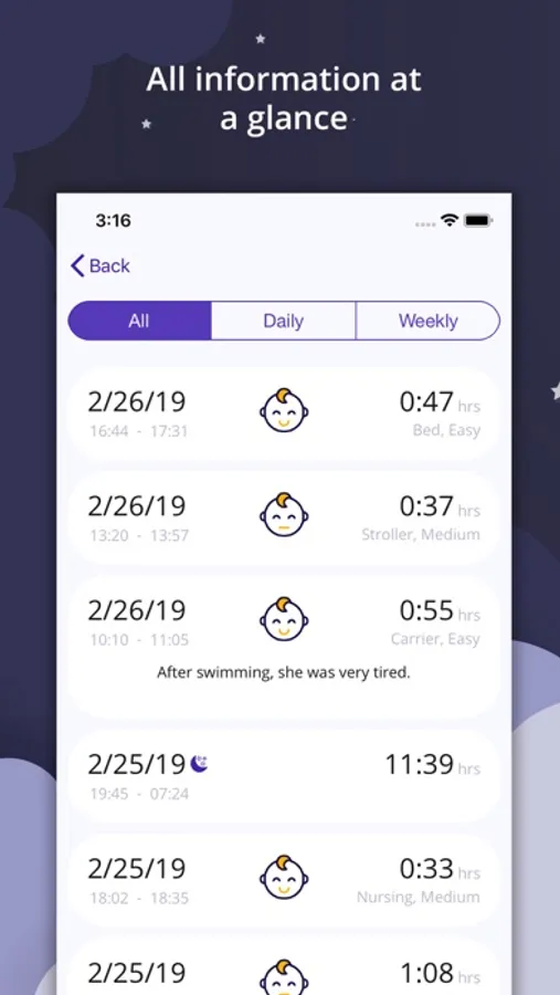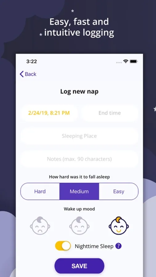 By providing information like the sleeping place, how hard it was to fall asleep and the mood the baby woke up in, we calculate the ideal time for the next nap and your baby's favorite sleeping places.