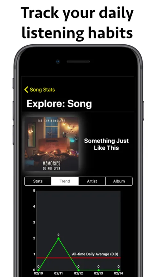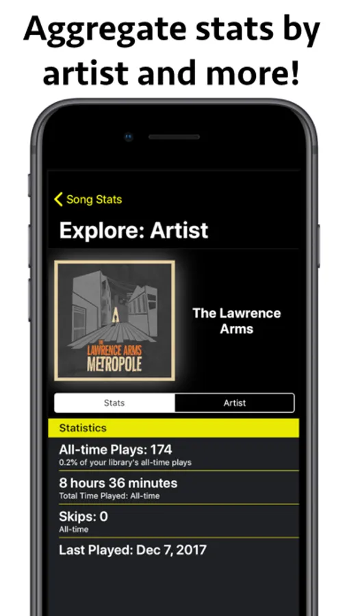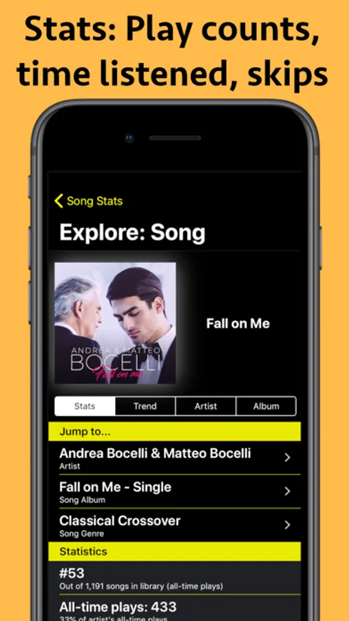 • Select a song or artist to see detailed stats in “Explore” mode. You can also quickly find related content, such as stats for other albums from the artist you’re viewing.