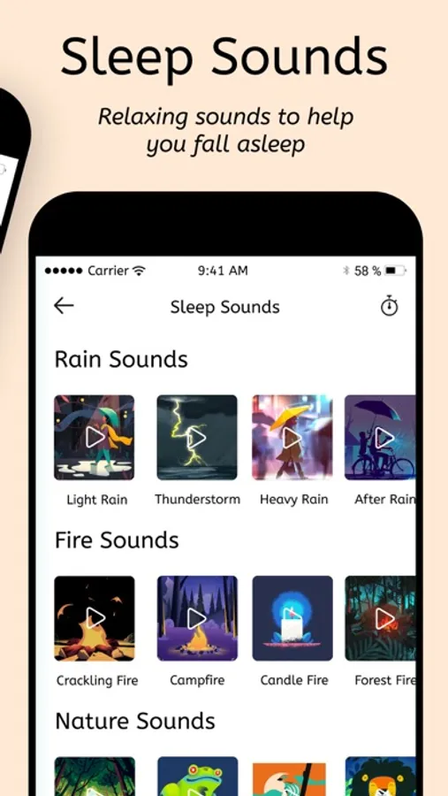 Listen to calming sounds while you're in bed to fall asleep faster and get a sound sleep. We have more than 200 sleep sounds, for example, sounds of a fireplace, rain, zen sounds, calming melodies, train sound, white noise and many more.