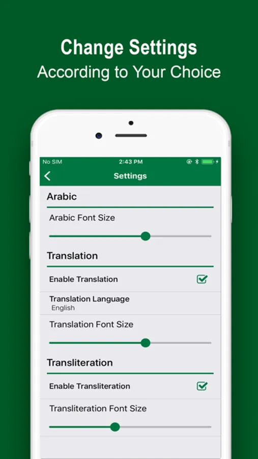 4 - Settings - Settings tab enables you to customize application according to your choice in which you can change font style and size. In setting, you can also change the Reciter among three popular Qaris of World.