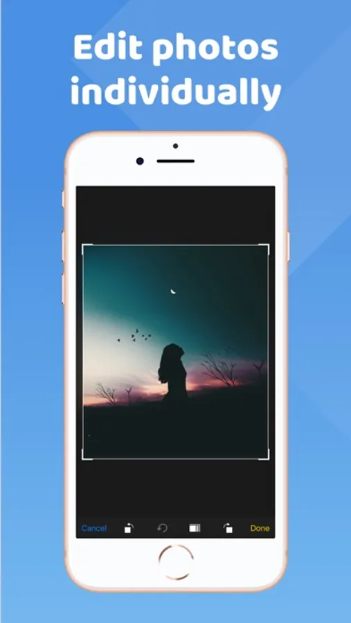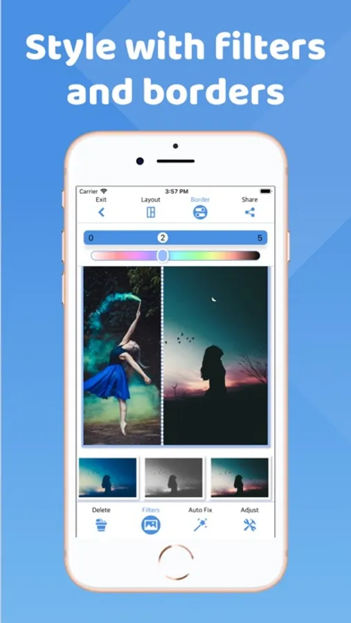 Change your collage border size and color, zoom and scale each photo, crop and rotate photos and apply filters to each photo individually. You can also add fun text to your photos.