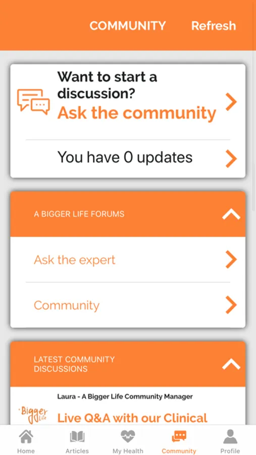 Alongside the Stoma Steps app, you will also be able to access the community at ‘a bigger life’ to chat in a safe place with other ostomates who have been through a similar experience, helping you get the information and support you need to adjust to your new life.