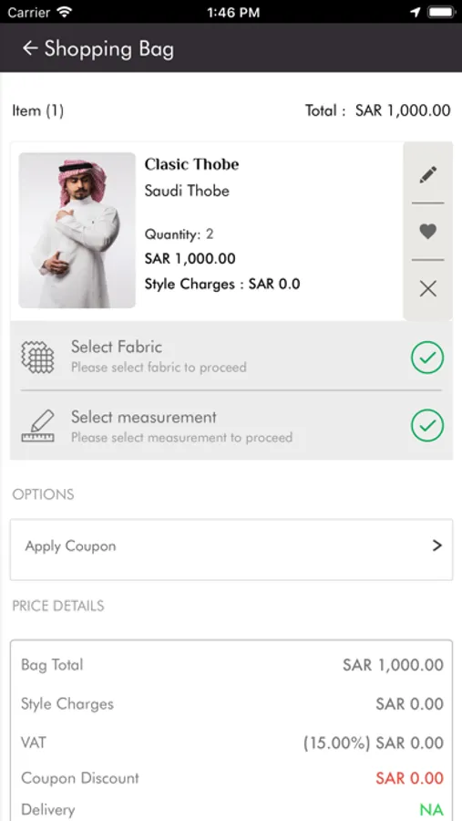 التطبيق المتخصص والأول من نوعه في الشراء و التفصيل حسب الطلب للملابس عموما والثياب الرجالية على وجه الخصوص ، يساعدك التطبيق بخطوات بسيطة في تفصيل ثوبك او الملابس التي ترغب بها وانت في مكانك ، حيث تقوم بالاطلاع على مختلف الموردين في التطبيق وتشاهد الموديلات وتختار منها بل وتقوم باختيار ما يناسبك من تفاصيل على الموديل ، ثم تطلب مندوب التطبيق للحضور اليك لأخذ القياسات واطلاعك على أنواع الأقمشة والخامات ، كل هذا يتم بخطوات سلسة جدا وصولا الى الدفع ومن ثم استلام المنتج في الموقع الذي تحدده.