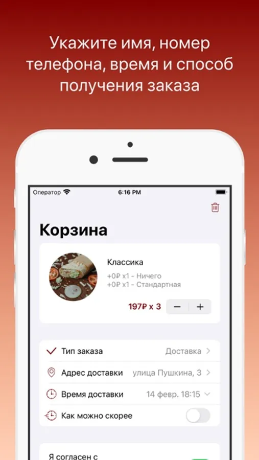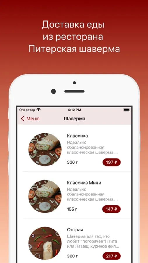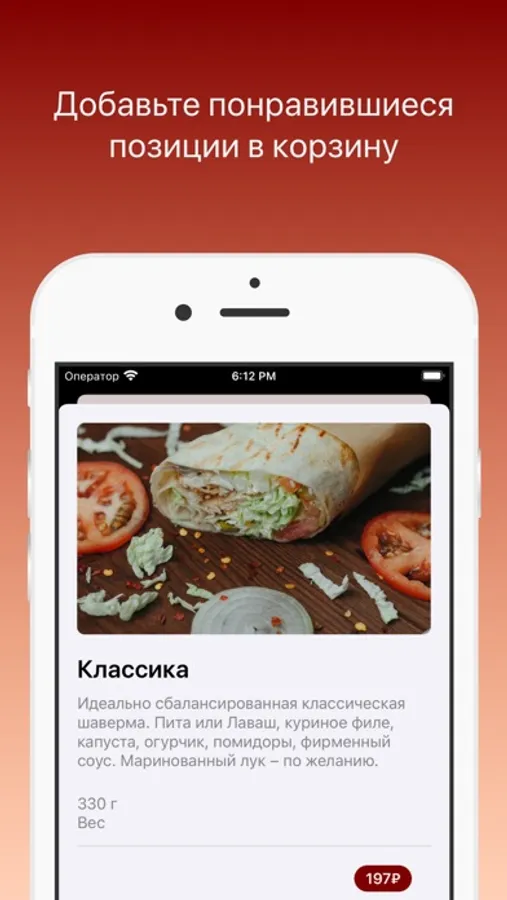 Как сделать заказ в приложении “Питерская Шаверма”: выберите понравившиеся позиции из меню, добавьте их в корзину и перейдите на экран оформления заказа (по нажатию на иконку корзины).