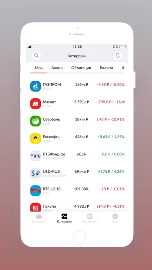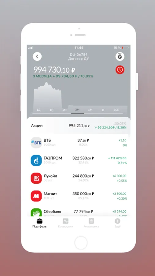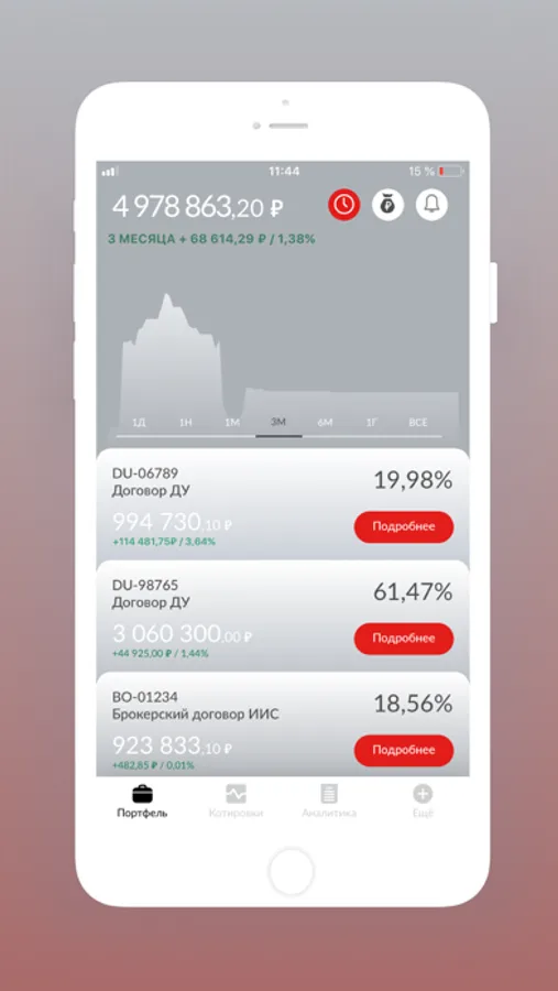 Оценка и структура активов доступна клиентам в режиме реального времени, аналитика предоставляется в различных валютах (RUR, USD, EUR) по каждой позиции и по портфелю в целом.
