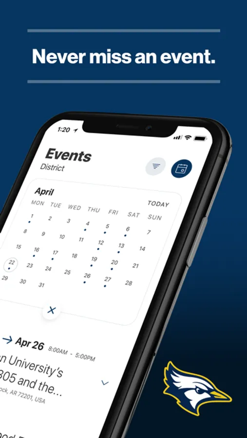 The event section shows a list of events throughout the district. Users can add an event to your calendar to share the event with friends and family with one tap.