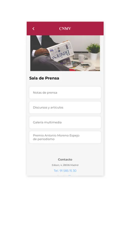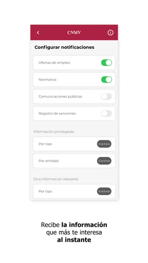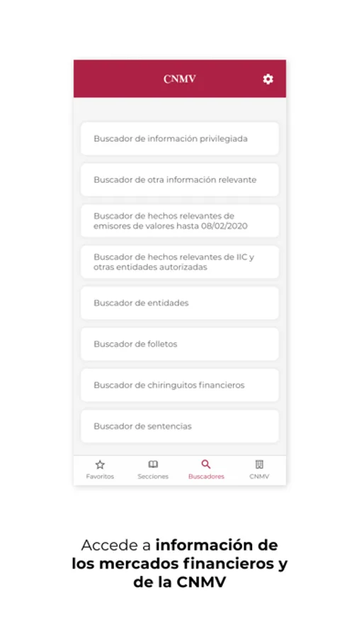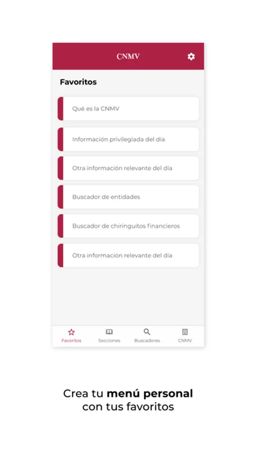 La Comisión Nacional del Mercado de Valores (CNMV) desarrolla esta aplicación para facilitar al público el acceso a la información que ofrece a través de smartphones y otros dispositivos móviles. Con ella, los usuarios pueden configurar un menú personal con los contenidos que más les interesen y recibir avisos con las novedades de las secciones que seleccionen, entre otras funcionalidades.