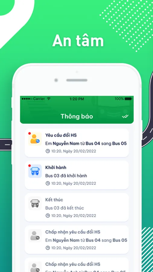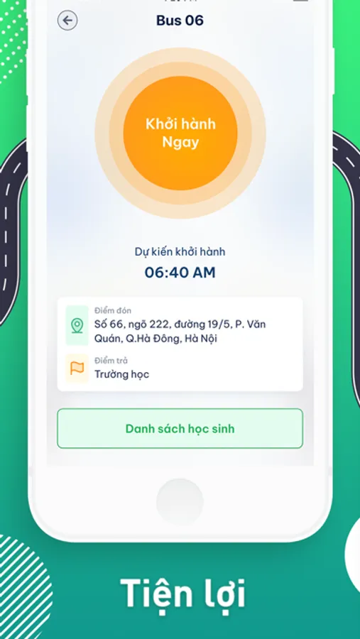 Quản lý danh sách xe, danh sách học sinh đăng ký, học sinh đang trên tuyến xe, tài xế và tuyến xe.