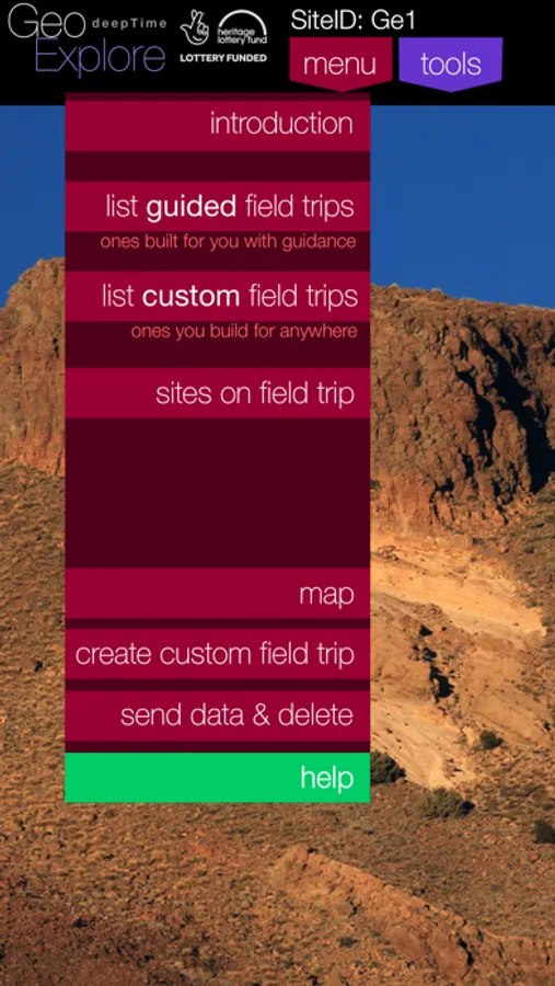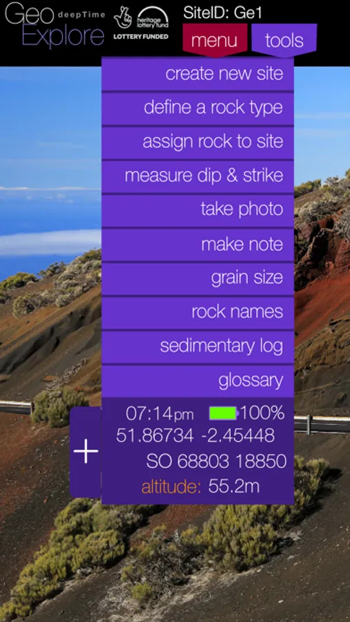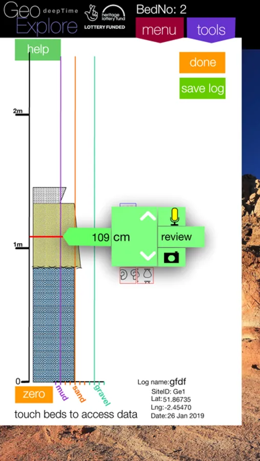 Use GeoExplore to gather data at any location(s) of your choice (a Custom Field Trip) or download into the app one of the Guided Field Trips, prepared by geology teachers and lecturers.. Guided Field Trips come with a map and suggested locations to explore, along with detailed information about those locations. These field trips often have a specific aim, e.g. a mapping exercise, or structural exercise. GeoExplore provides a toolkit consisting of compass/clinometer, graphic (sedimentary) logging tool, make audio notes, text notes and take photos all linked to a specific site, or to a bed in the logging tool. Other facilities include rock type information, grain size reference, glossary of terms (which may be customised to field trip topic). Means to assign rock types and link them to observation sites in a mapping exercise.