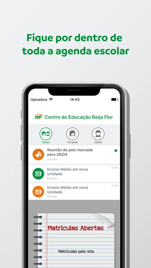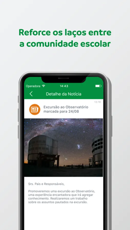 Com este aplicativo, os pais, responsáveis e professores poderão receber as últimas informações da escola, as notícias do dia a dia dos seus filhos e o calendário de atividades escolares.
