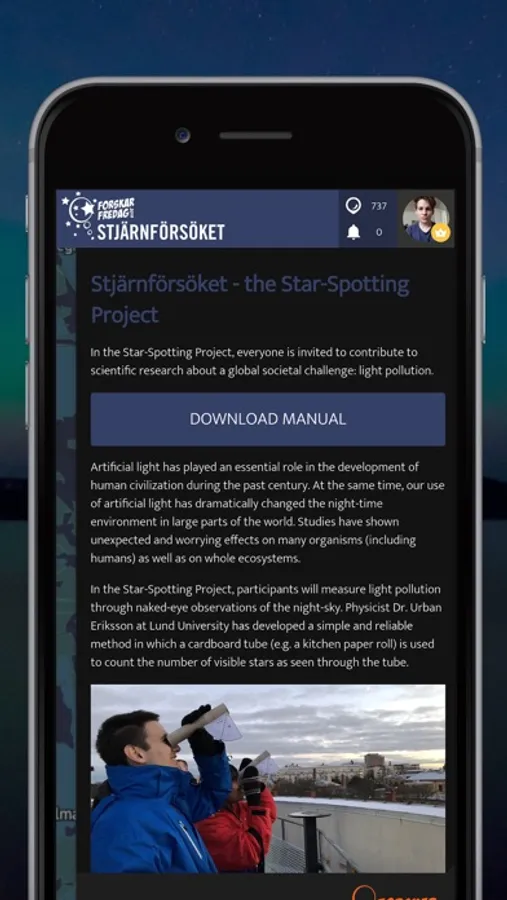 In the Star-Spotting Project, participants will measure light pollution through naked-eye observations of the night-sky. Physicist Dr. Urban Eriksson at Lund University has developed a simple and reliable method in which a cardboard tube (e.g. a kitchen paper roll) is used to count the number of visible stars as seen through the tube.
