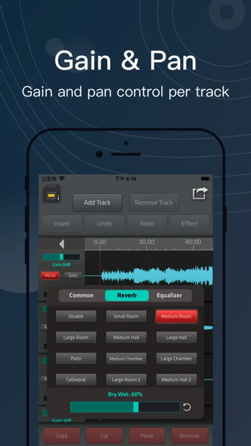• Music Editor: Trim clip from music file, auto tune gain, pitch and pan to change the tone and export it.