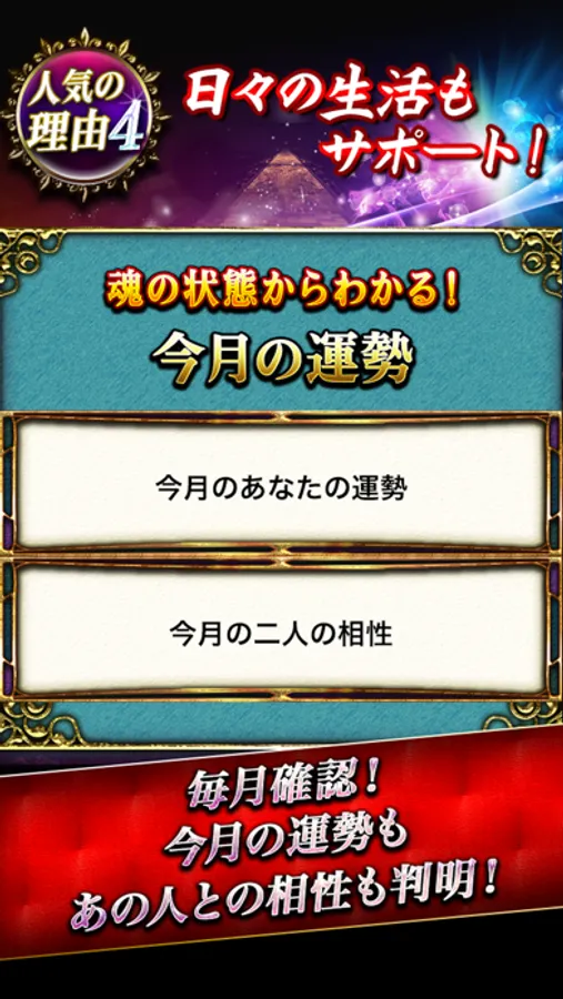 ※有料にて購入された鑑定メニューは、メニュー一覧下の「購入履歴」から何度でも閲覧することができます。ただし、端末を移行された場合は履歴情報が引き継がれませんので、画面キャプチャ等で保存することをおすすめいたします。