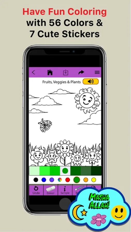 18 Listen & Color illustrations with Islamic themed stories that children will love.