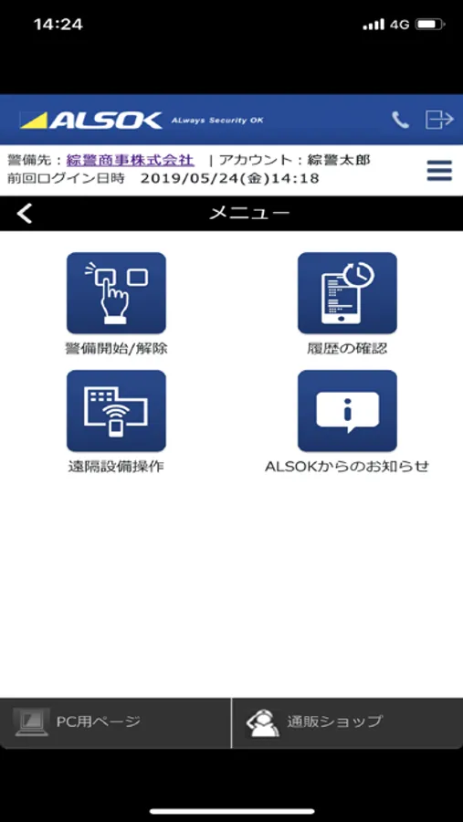 このアプリで操作できる項目は、①警備操作、②設備の遠隔操作、③お客様施設の警備状況の確認、④警備履歴の確認、⑤ALSOKガードセンターへの連絡、⑥ライブ画像の閲覧、⑦イベント画像の確認、⑧お知らせの確認が行えます。