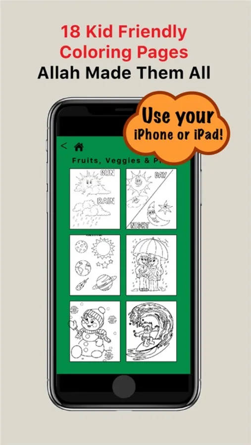 18 Listen & Color illustrations with Islamic themed stories that children will love.