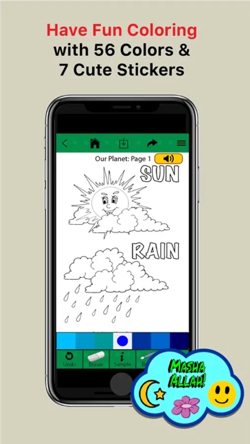 For example, on the “Sun & Rain” coloring page you will color and listen to an explanation of how, it is Allah, who has created the sun and makes it rain for our benefit.