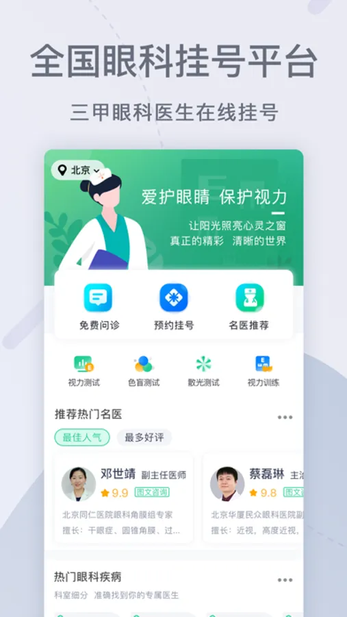眼科医院挂号网,是全国专业全面的眼科疾病就医挂号平台,揽括全国三甲医院及专科医院优质专家医生。APP提供预约挂号、医院医生评分、疾病咨询、眼科疾病自测工具等多项服务,花最少的时间,选好眼科专家,专病专治。