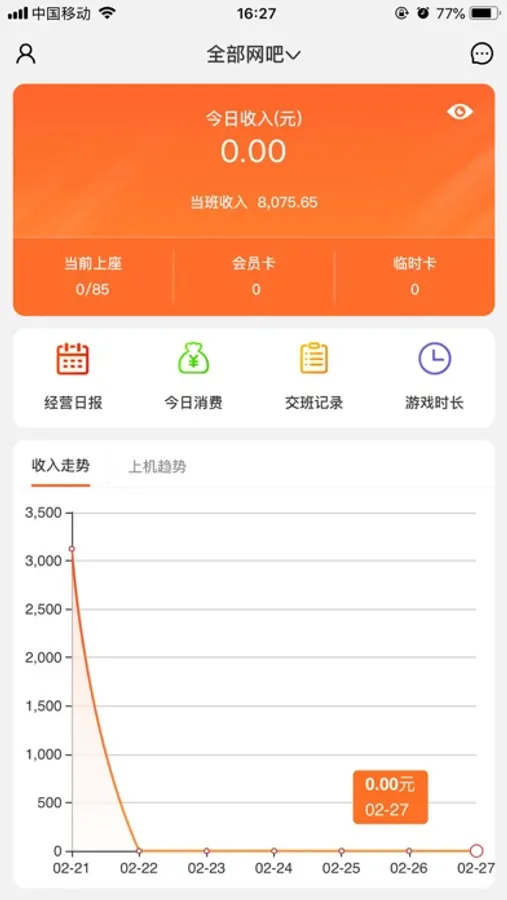 4、网吧收入统计:提供今日收入、当班收入、今日消费、收入走势、上机趋势统计,帮助网吧提升收入。