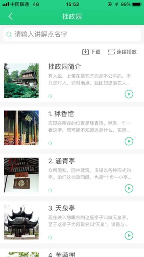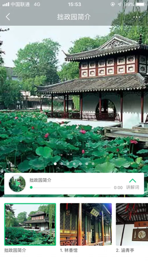 拙政园讲解提供了专业的景点讲解语音导游服务,通过GPS+微定位景区导览技术,在拙政园你可以实现走到哪里听到哪里,不同风格真人大牌主播的语音导览让你聆听最专业的拙政园讲解,就像导游带着出游一样。