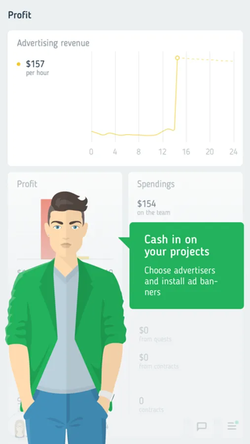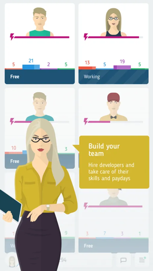 Search for candidates, screen resumes and hire specialists. Distribute tasks and take care of your employees' workload and exhaustion level. Give paychecks and strengthen your team with gadgets and equipment. Monitor your employees' skills, train or fire them.