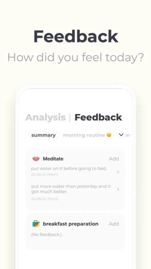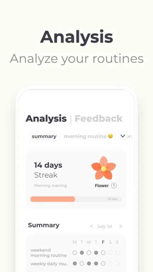 Review your routine performance daily, weekly, and monthly. Your completed routines and reviews become a journal of your growth. Visualize your progress with plant badges that grow as you keep your streak going.