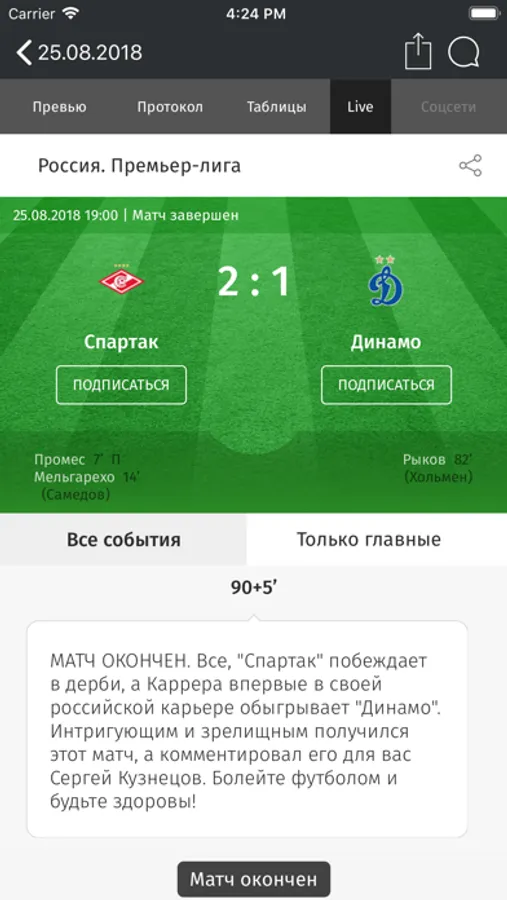 - текстовые трансляции всех встреч Российской футбольной премьер-лиги;