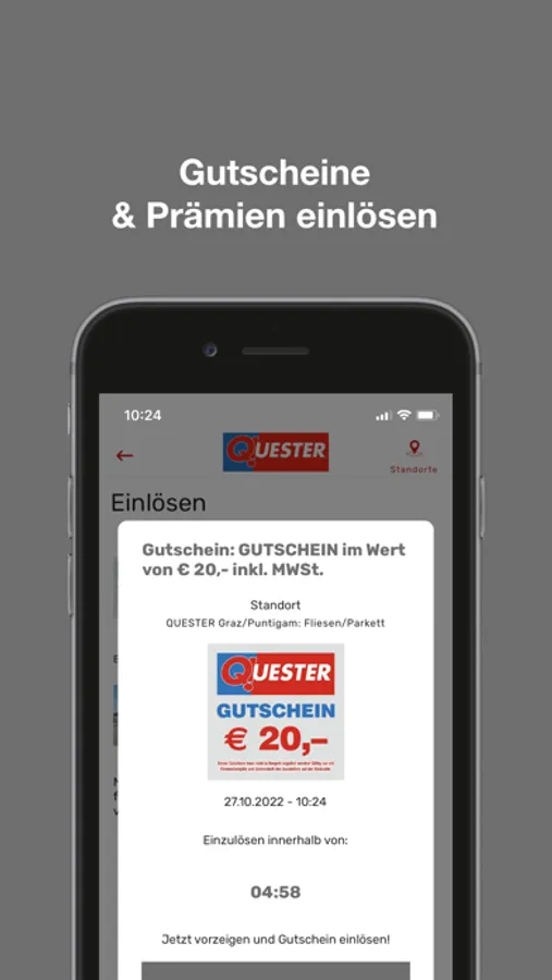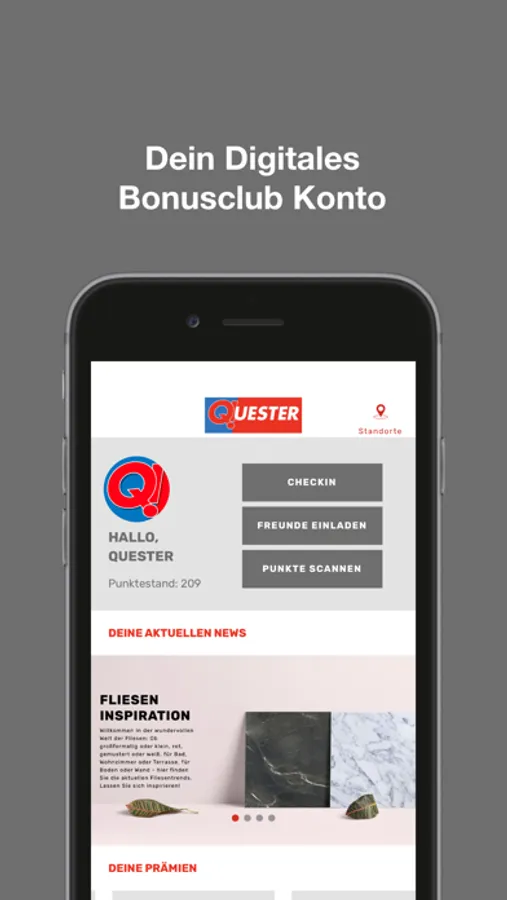 Die QUESTER-App ist dein digitales Treueprogramm! Du kannst ganz einfach durch unterschiedliche Aktivitäten Punkte sammeln und diese gegen tolle Prämien einlösen.
