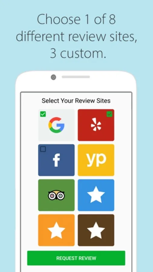 • 8 review site choices including Google, Yelp, TripAdvisor, facebook, YP.com and 3 review sites of your choice.