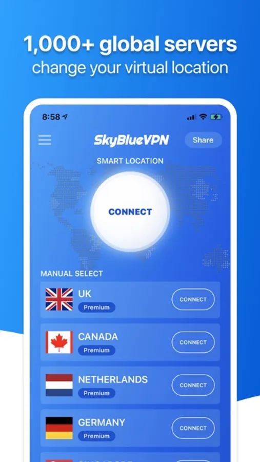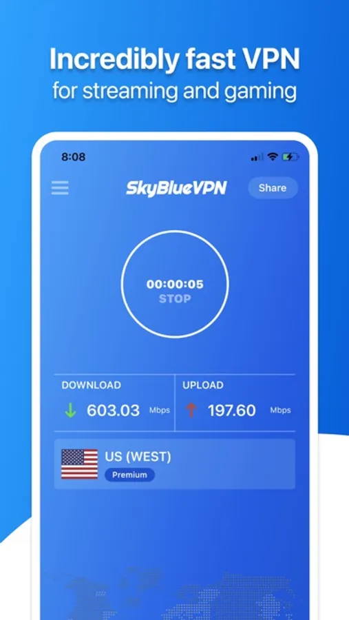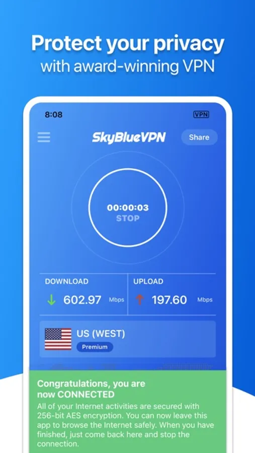 SkyBlueVPN is Crazy Fast! It detects your location automatically and connects you to the nearest server; as a result, your connection will be 10x faster than >90% of other VPN providers.