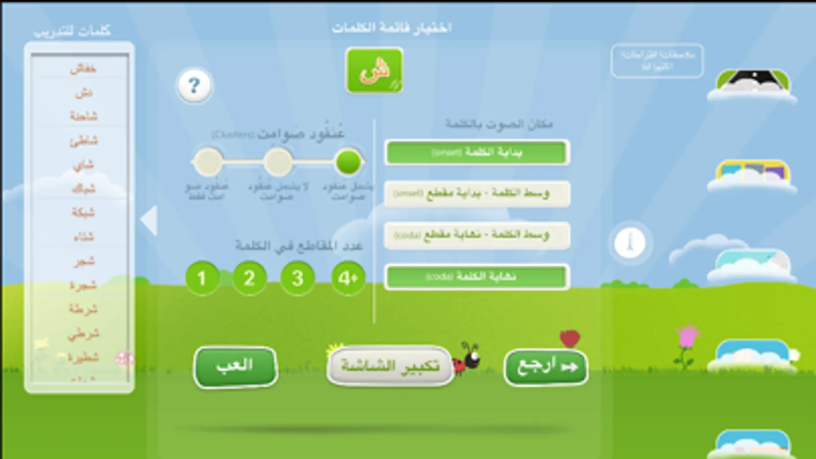 امكانية اختيار قائمة كلمات تشمل: عنقود صوامت، عدد مقاطع