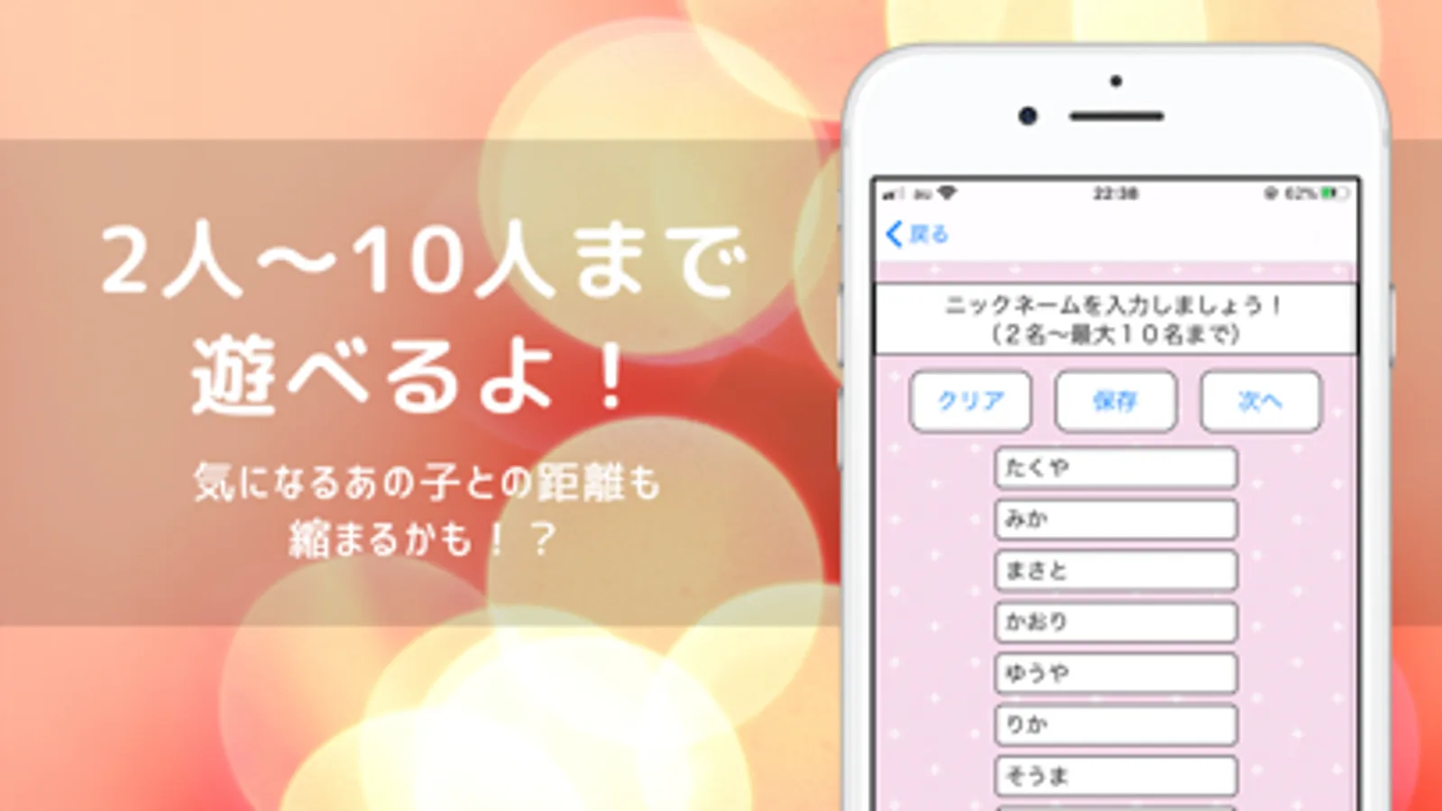 2.参加者のニックネームを入力します。最大10名まで参加可能です。ニックネームを保存するには「保存」ボタンを、クリアするには「クリア」ボタンを押してください。「次へ」ボタンを押すと結果発表画面へ進みます。