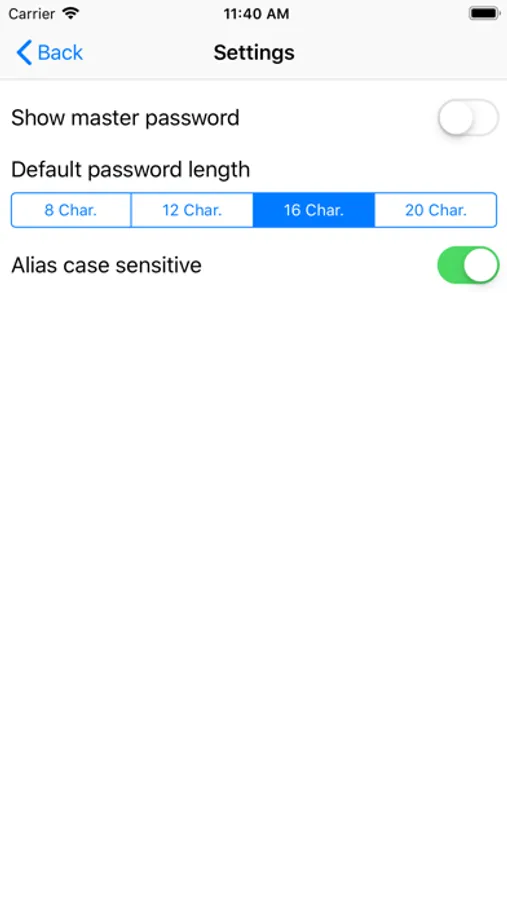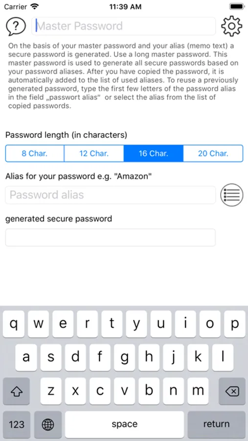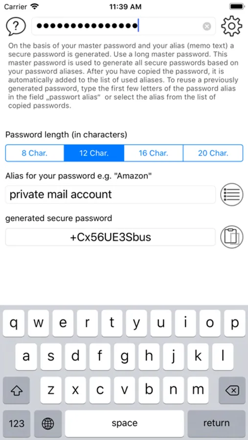 The app generates absolutely secure passwords. The generated passwords are generated on the basis of a 256-bit encryption mechanism. Enter a keyword for your password and the app will generate an absolutely secure password along with the master password.