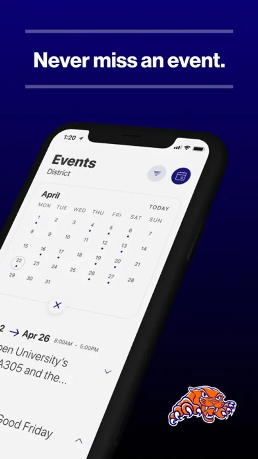 The event section shows a list of events throughout the district. Users can add an event to their calendar to share the event with friends and family with one tap.