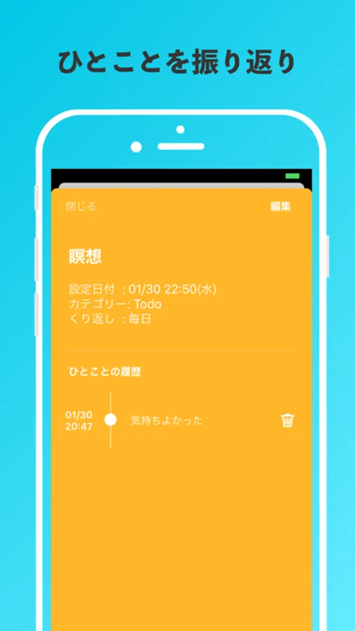 記入されたひとことは、Todoをタップした後に表示される詳細画面で見ることができます。詳細画面より、削除することもできます。