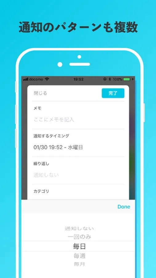 1回きり、毎日、毎週、毎月とお好みのタイミングで通知をお届けします。