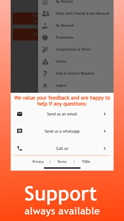 Customer support always available via email or chat functionality straight from your phone.