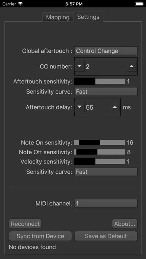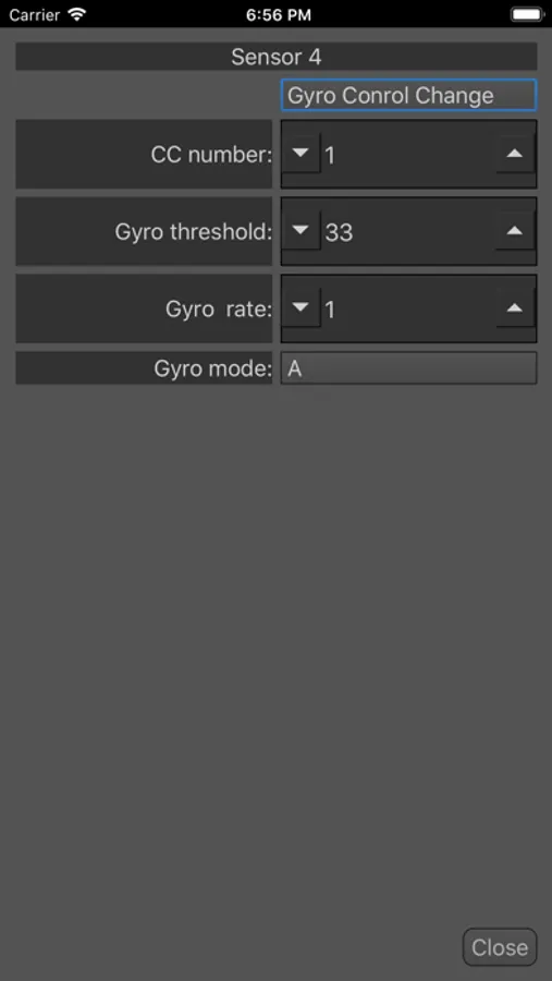 - Change sensor types between note, cc, bend, action and gyroscope control.