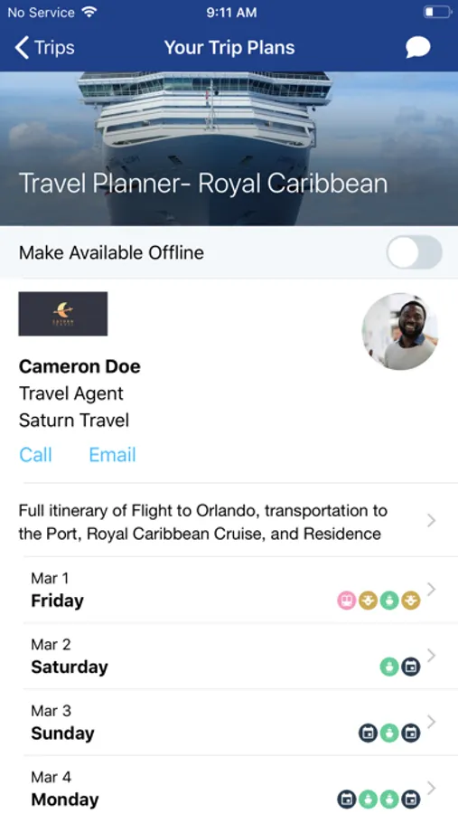 After planning your dream getaway with your vacation specialist, they will send you an itinerary for each trip they book you on complete with all relevant details and their contact information. You will have a record for all travel plans including: shore excursions, tour details, dining reservations, accommodations, departures, arrivals and anything else you and your vacation specialist have planned for your amazing getaway. Your vacation specialist will provide the information on hotels, flights, cruises, restaurants, landmarks and more! Itineraries get synced into this app so you can make sure you are on time to have a great time every time.