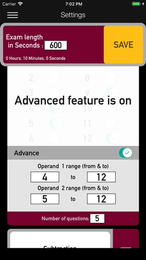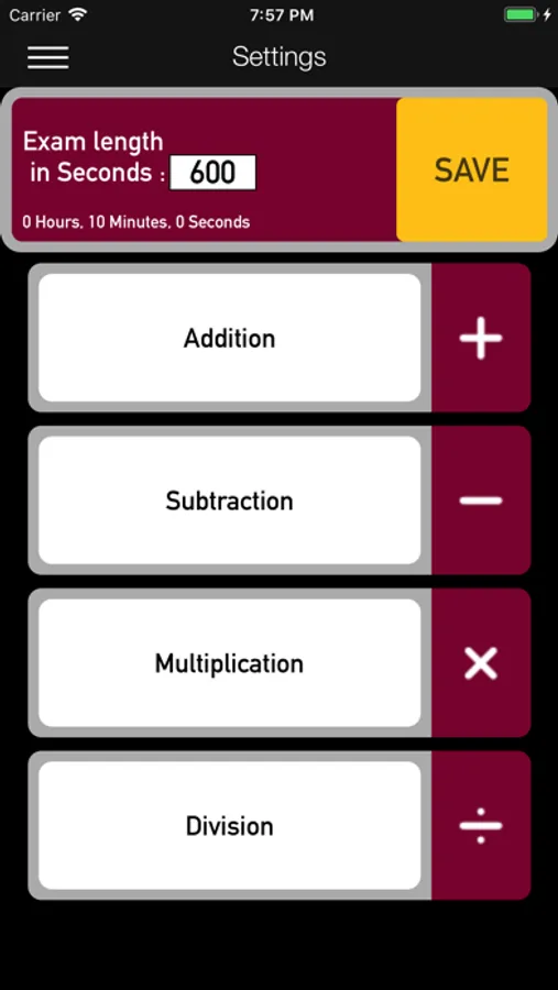 You can specify the exam length in seconds. Once you enter the time in seconds, the app will do the real time conversion to Hours, Minutes and Seconds that will help you to double check the exam duration. You will find four sessions in this app setting such as, Addition, Subtraction, Multiplication, Division. Each session has three sessions.