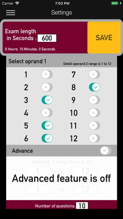 The second session is called "Advance" In this session the app will offer you the ability to choose the first operand range and the second operand range. The range of 1 to 999.