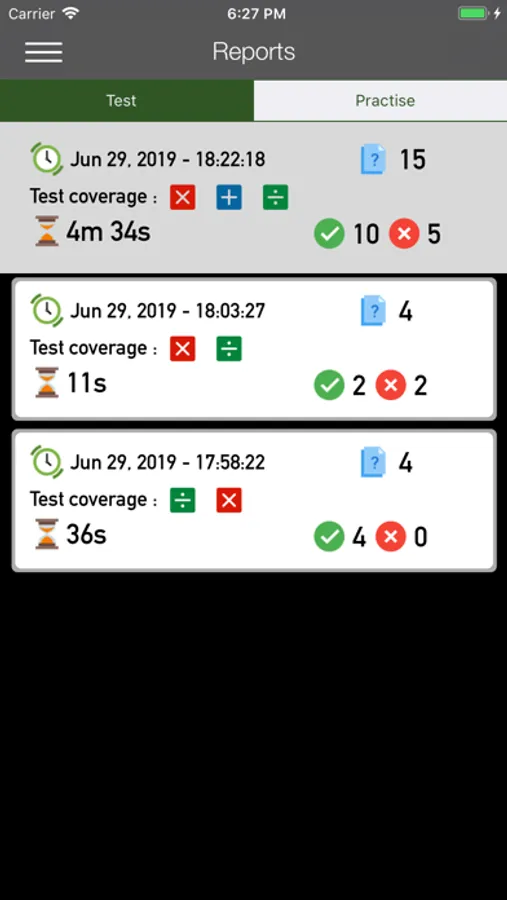 Each session will display the Test/Practice details such as attended time, total number of questions, how many answers are correct and wrong, Test coverage mean what are the operations included in the test and total time taken for the test.