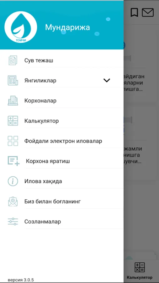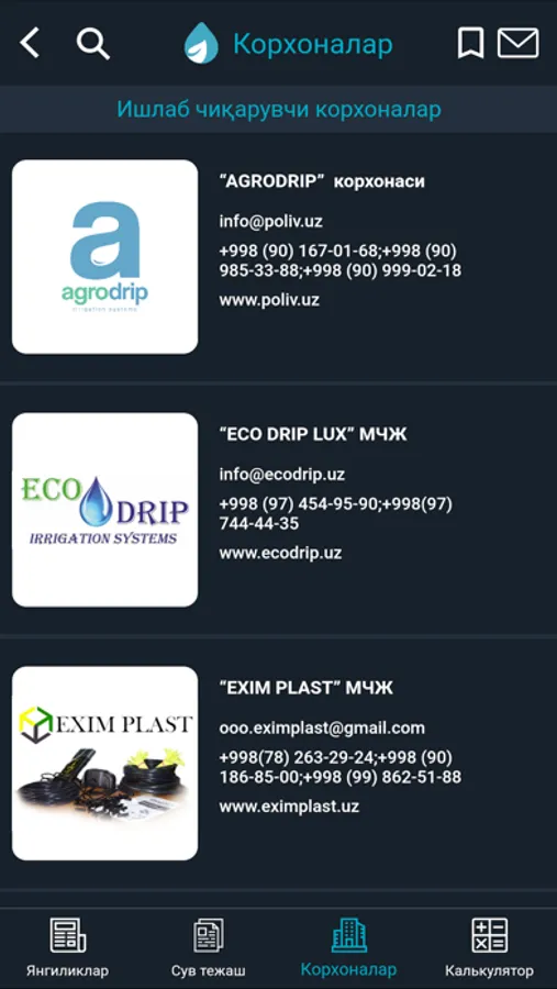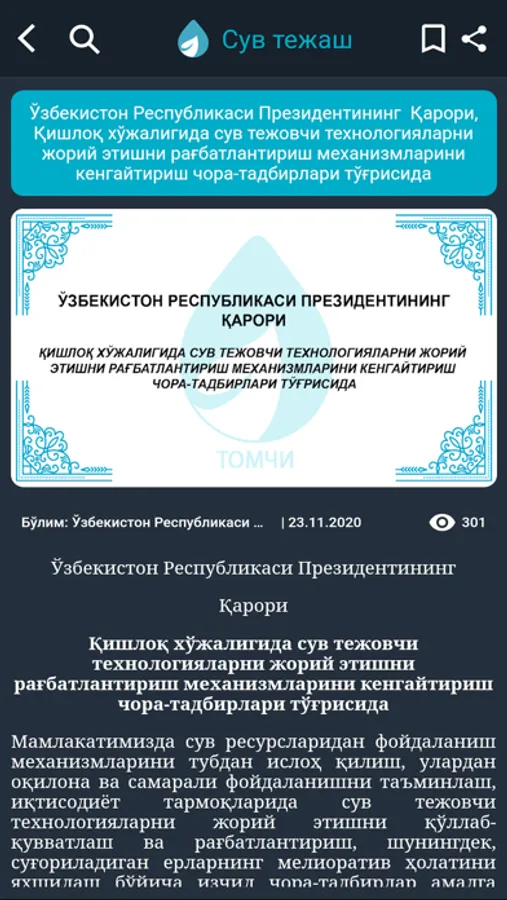 Мобил иловадаги маълумотлар сув хўжалиги ходимлари ва фермерлар малакасини ошириш мақсадида ишлаб чиқилган материаллар ҳамда бошқа манбалар асосида тайёрланган.
