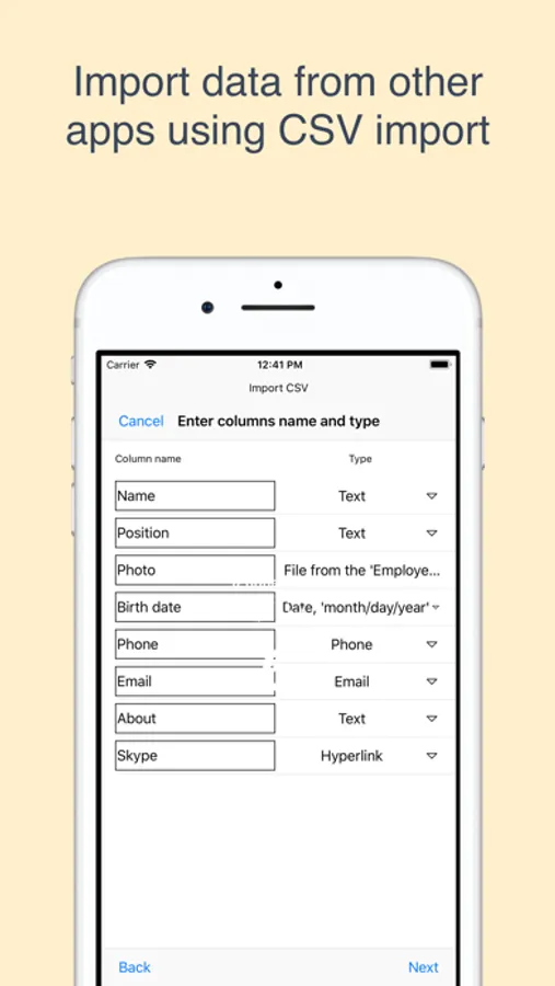 MobiDB is an offline database app with unique cloud sync. CSV import enables data exchange between mobidb and Access, Filemaker, Excel. Intuitive visual form designer will help you arrange information on your screen in an attractive and readable manner.
