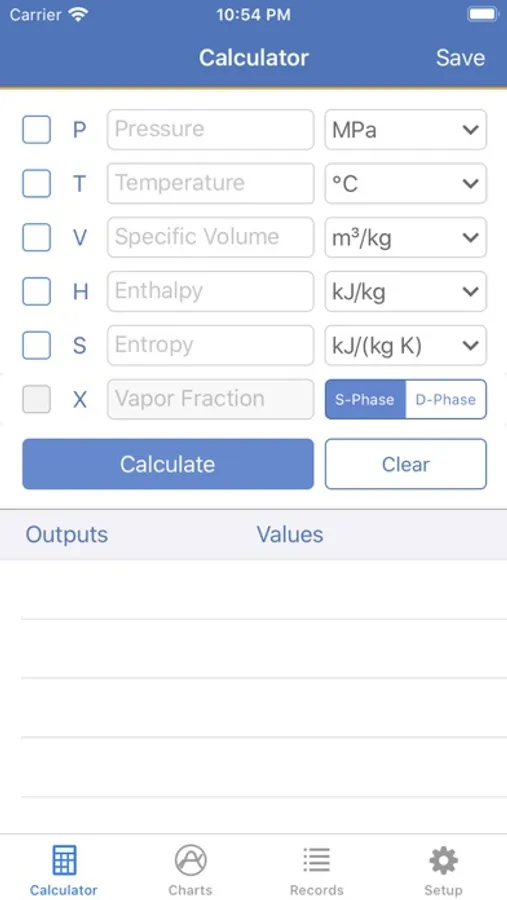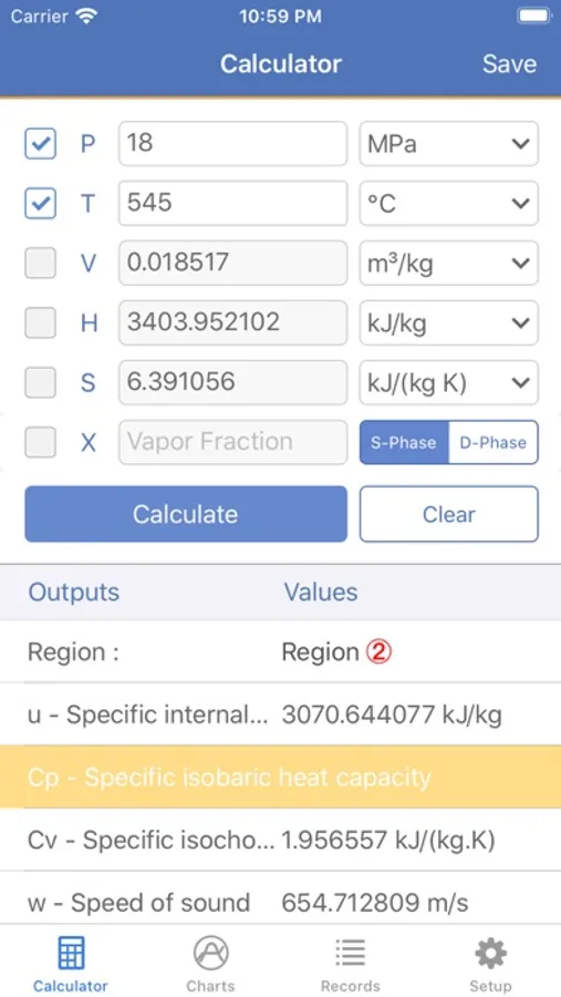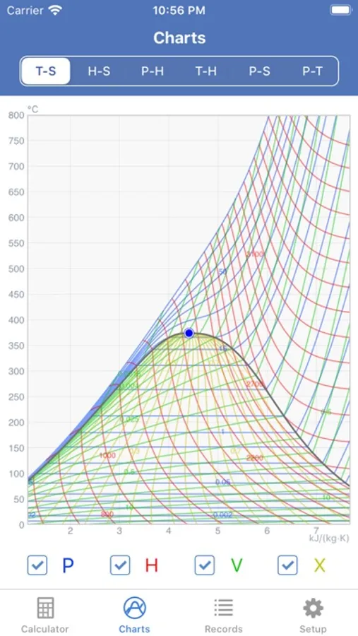 Typical thermodynamic charts are embedded in this app, and displayed as vector-graphs. Only regions 1 to 4 are shown in the charts, and region 5 is ignored for the applicative concern. The gradual changes (the lines) of the other 4 parameters along with the X and Y ordinates, are shown in the charts.