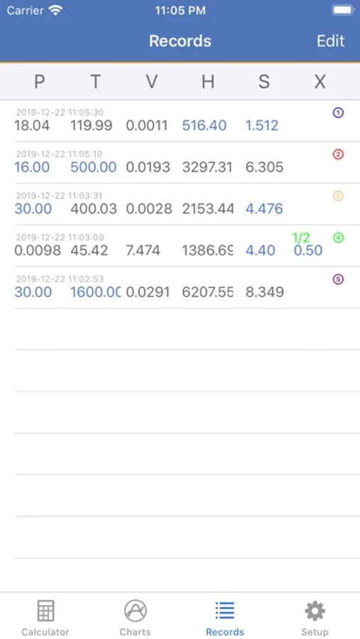 The calculated records, each of which contains 6 basic parameters, can be stored in a row in the list of the Results panel by clicking the Save button on the Calculator panel.