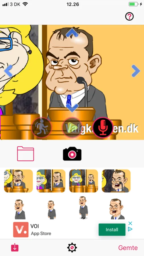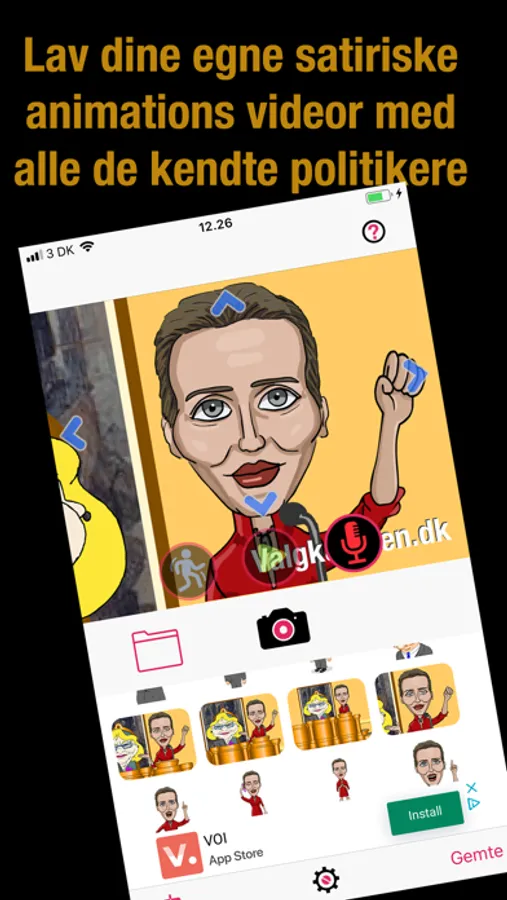 Du kan også bruge karakterene ovenpå de billeder du har på din telefon eller du kan tage nye billeder med politikerne på. Blot tryk på kameraet eller billedefolderen og vælg. Hvis karakteren ikke stemmer helt præcist kan du trykke og holde på karakteren. Når den bliver rød kan du flytte rundt på den og gøre den større eller mindre så den passer perfekt ind i dit billede.
